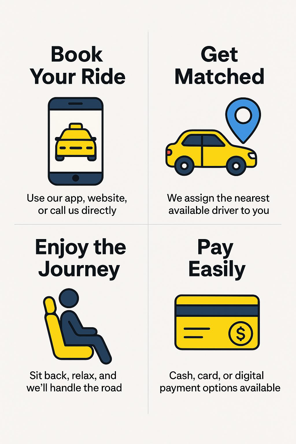 Convenience – With 24/7 availability and multiple booking options, your next ride is just a tap or call away.